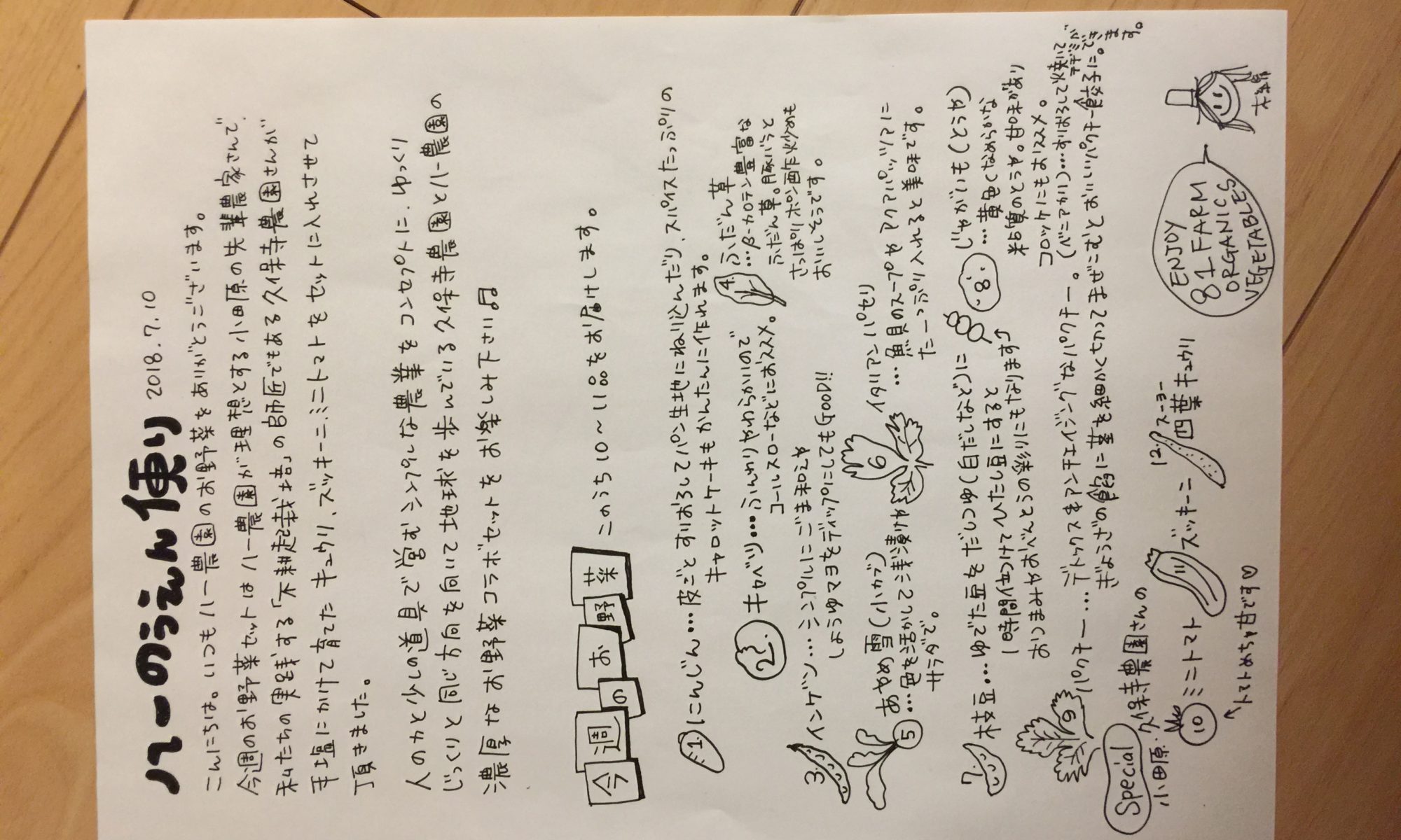 【今週のお野菜セット】2018.7.10(tue) ・枝豆・ 人参・キャベツ・平莢インゲン・あやめ雪・シシトウ・ピーマン・イタリアンパセリ・パクチー・フダンソウ・ミニトマト (久保寺農園)・ ズッキーニ (久保寺農園)・四葉キュウリ (久保寺農園) の中から6〜12品