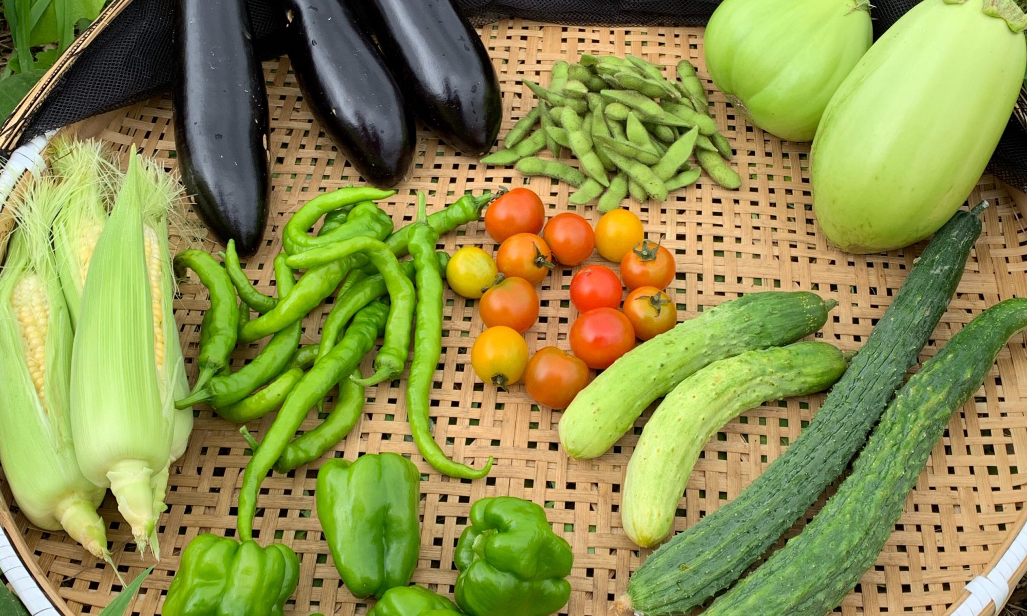 ・キュウリ(四葉 相模半白)・真黒ナス・青大丸茄子 ・白丸茄子 ・伏見甘長唐辛子・ピーマン・ミニトマト・トウモロコシ ・枝豆