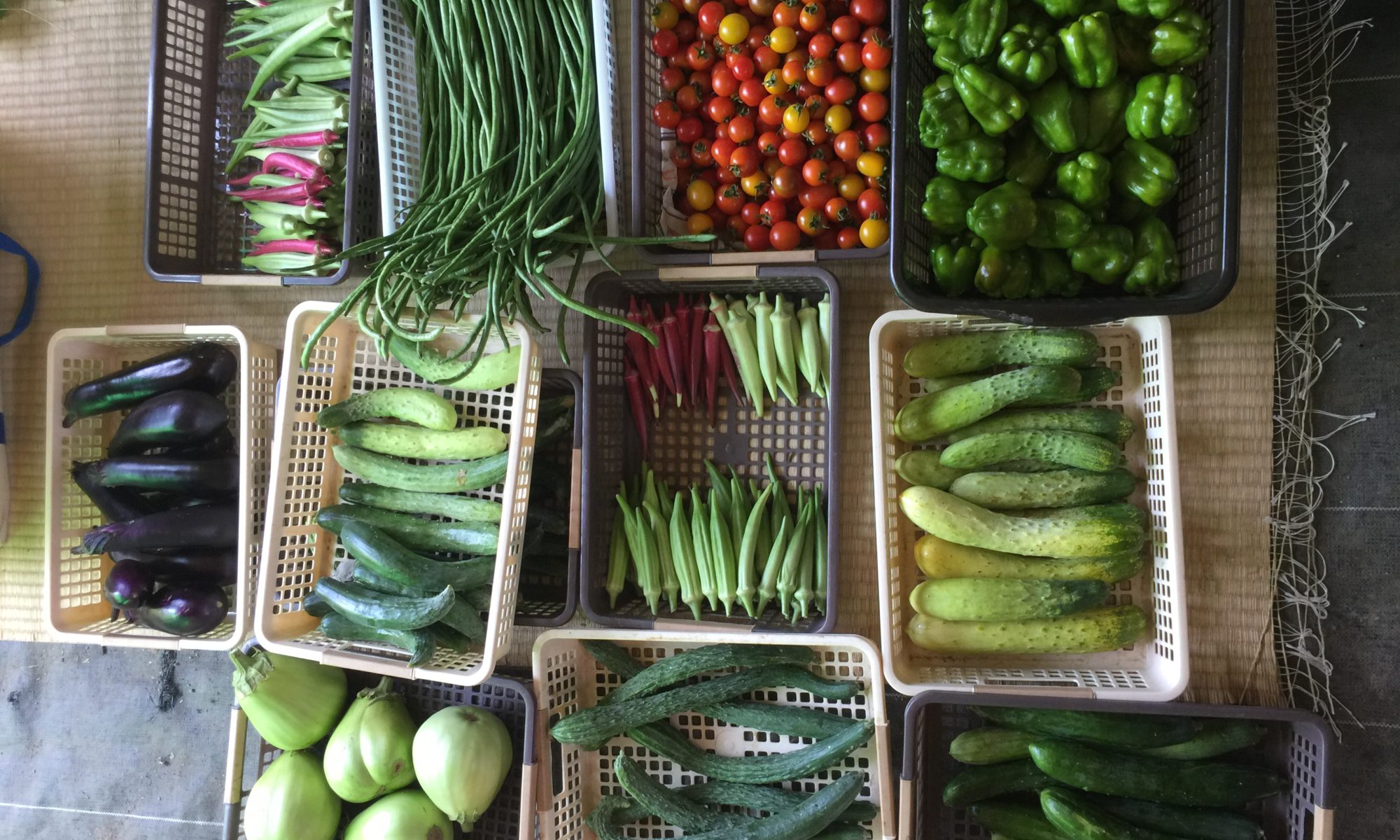 ・キュウリ(四葉 相模半白)・真黒ナス・青大丸茄子 ・白丸茄子 ・ピーマン・ミニトマト・ササゲ・オクラ・空芯菜